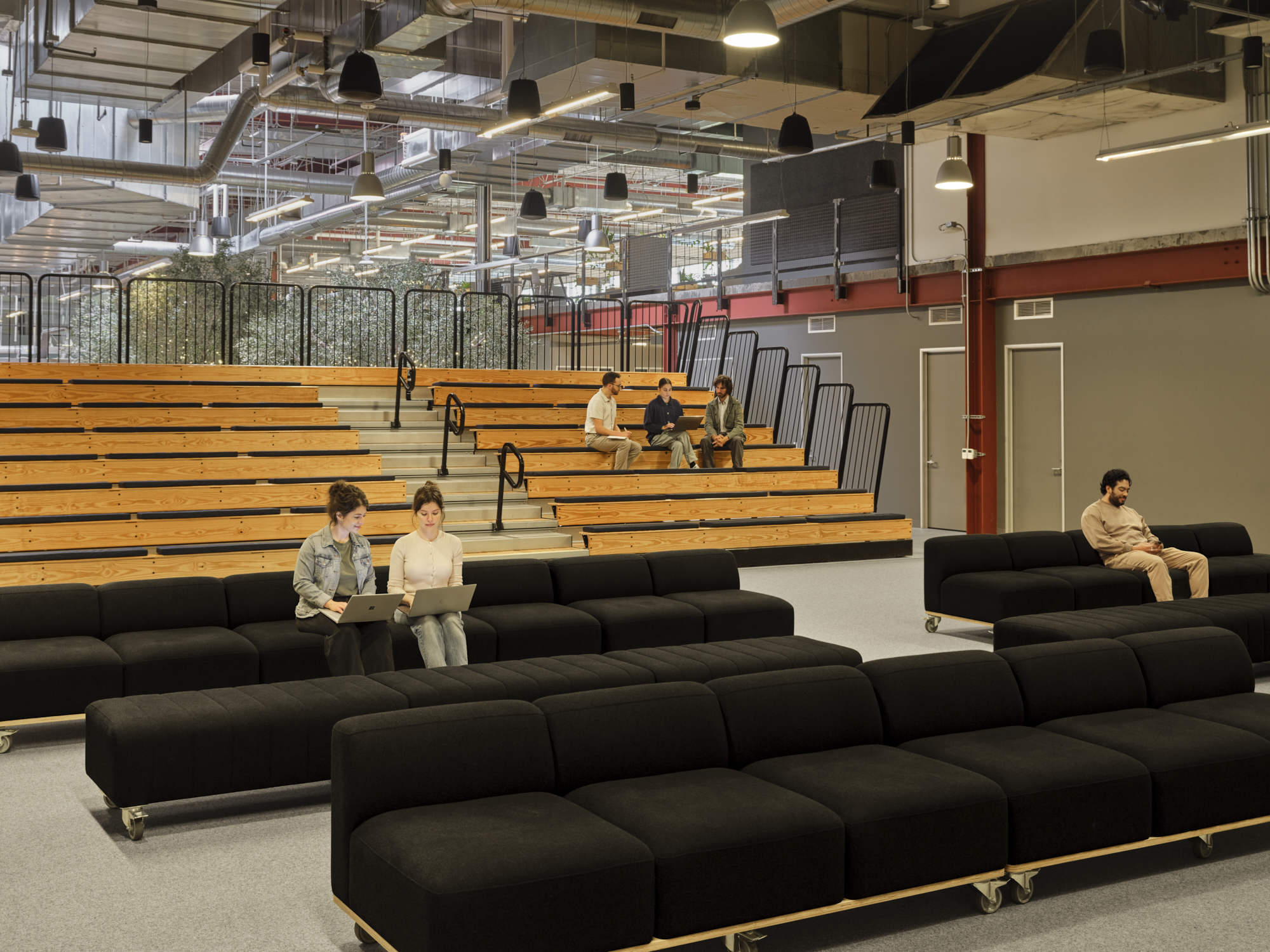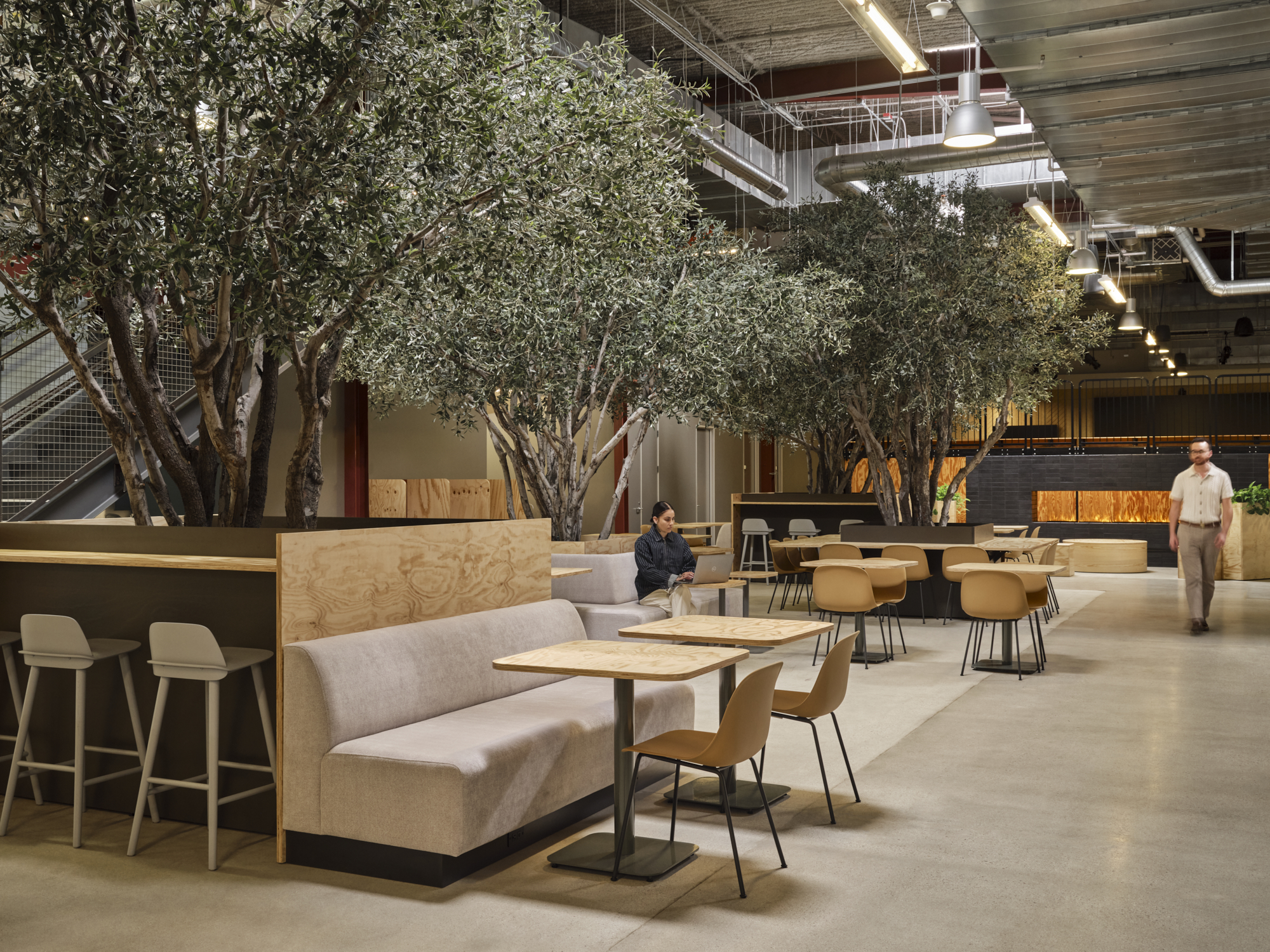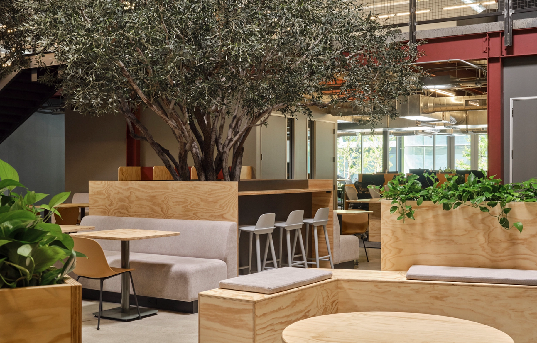 A new central and interior coffee area was created with four full-sized trees, each integrated with custom millwork seating to provide additional drop-in workspaces and casual seating for breaks within a sheltered and intimate setting.