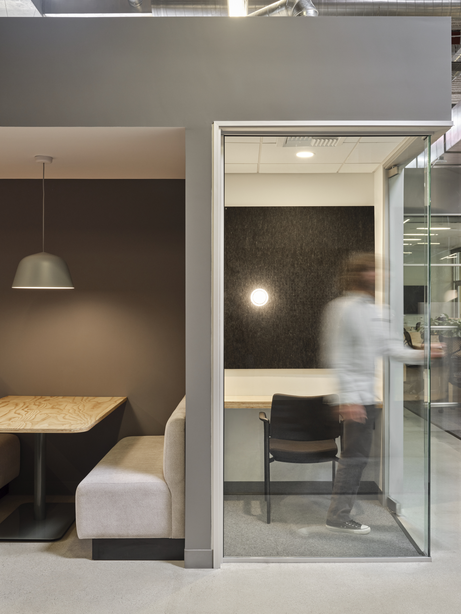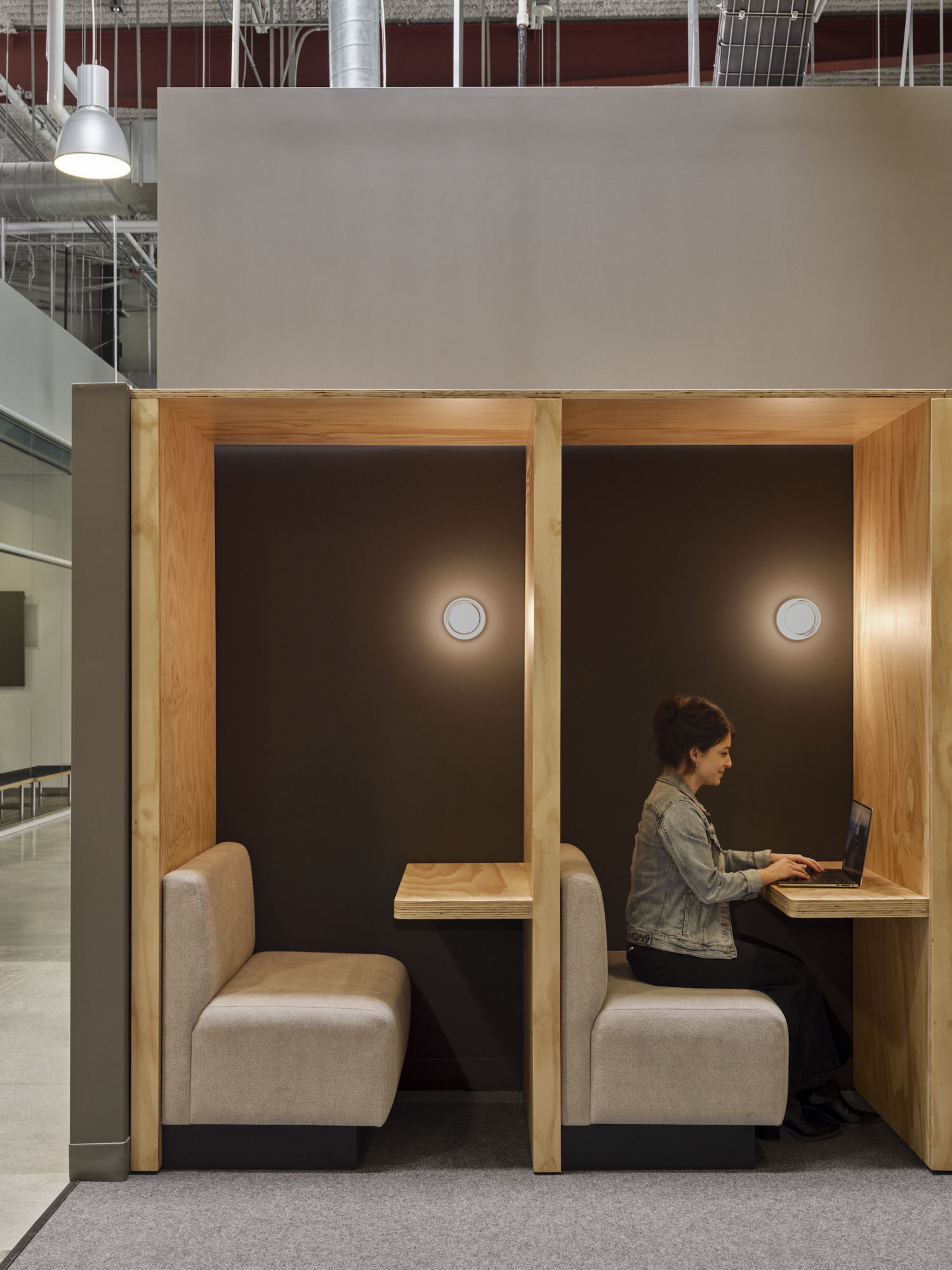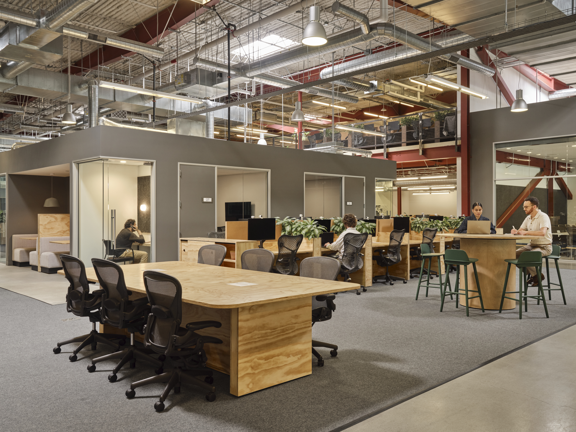 One of the project’s core challenges was fitting a growing workforce into a more compact footprint. To achieve this, workstations were thoughtfully designed with built-in planter box dividers, offering privacy while integrating biophilic elements. Drawing inspiration from the original space, two tones of plywood were used – one natural and unfinished and the other a warm walnut was used for new built-in furniture settings, including the workstations. These material choices offered a cost-effective way to introduce authentic wood while visually distinguishing each neighborhood and adding warmth to the otherwise industrial interior.
